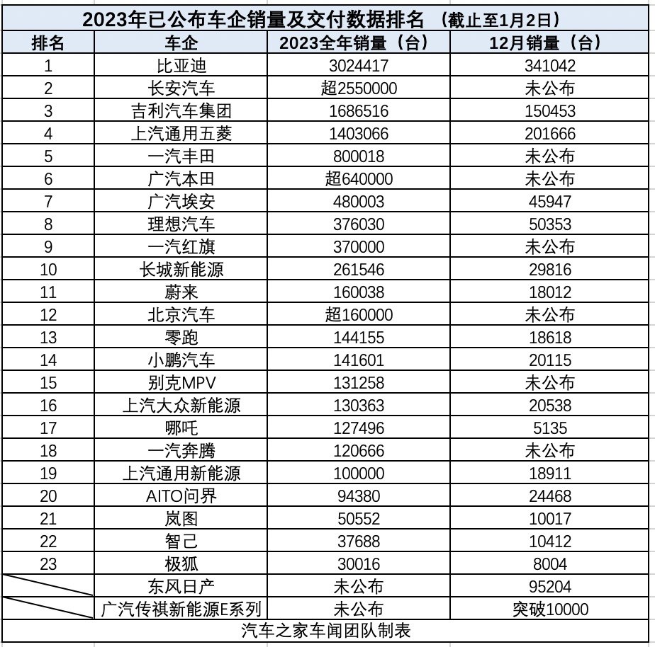 2024-01-03 10:01:142024年新年伊始,各大車企公布2023年銷量及交付數據,我們也對目前已經公布的全年銷量及交付數據進行排名,截止至1月2日。比亞迪、長安、吉利三大汽車集團位列2023年銷量排名前三。