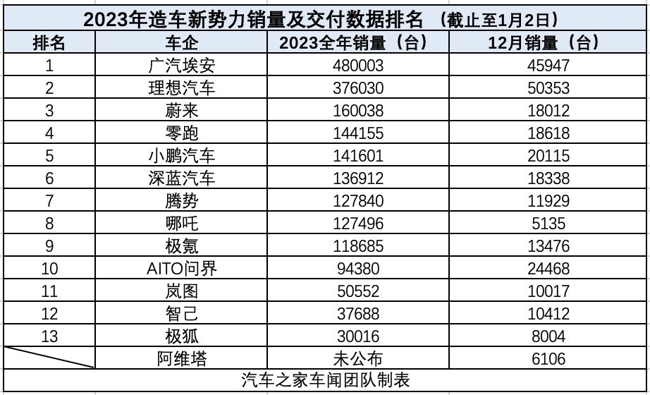 中國品牌新勢力方面,埃安和理想成為第一梯隊的成員,埃安2023年累計銷量48萬臺,同比增長77%,理想全年累計交付超37萬臺,同比增長182.2%。值得注意的是,理想12月銷量已經突破5萬臺,而到2024年,理想要沖擊全年銷量目標是80萬輛,月銷量挑戰10萬輛,單車月銷量沖擊3萬輛。