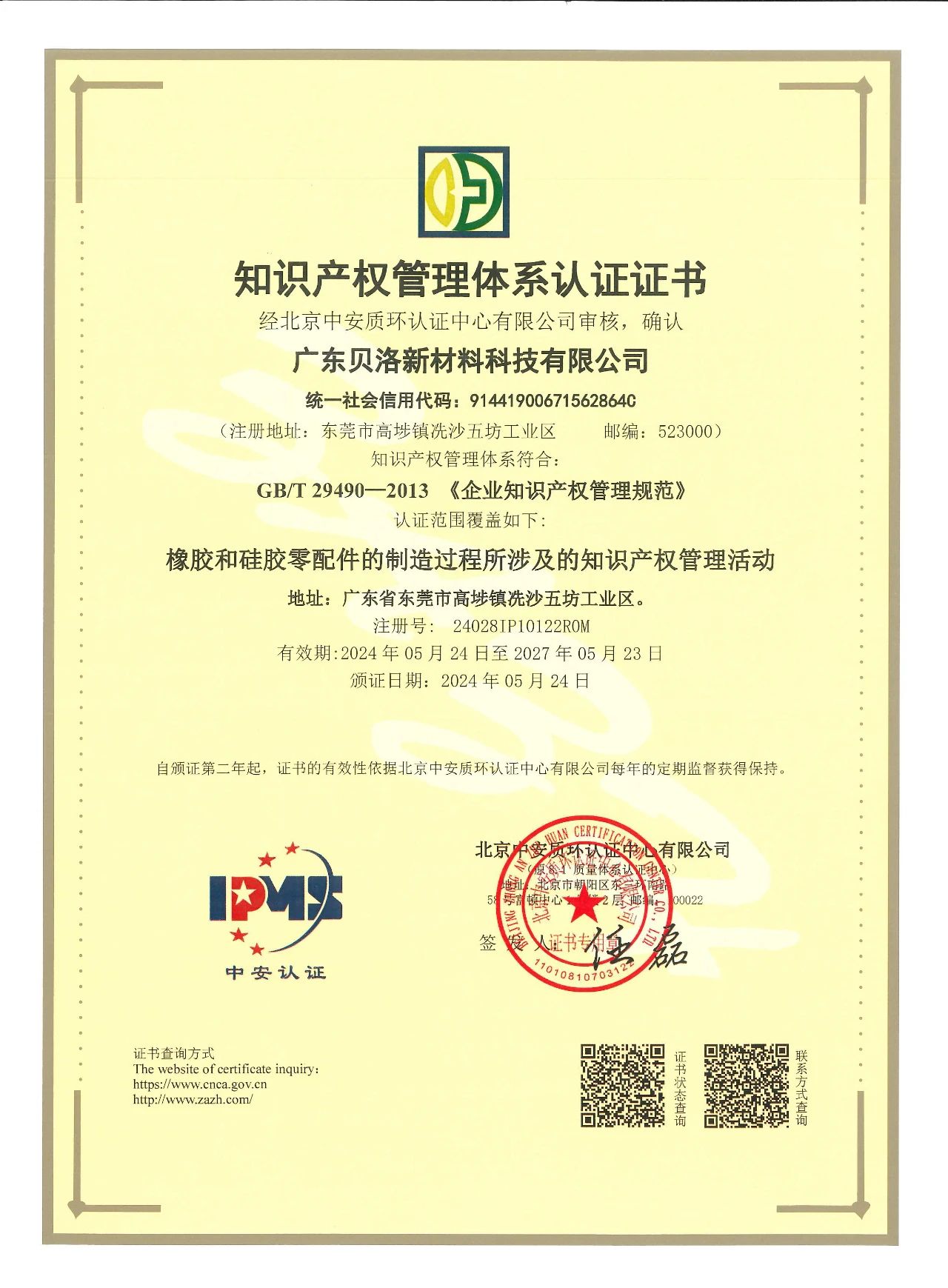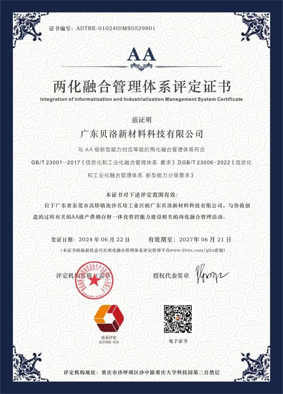 廣東貝洛新材料科技有限公司順利通過國家工業和信息化部《信息化和工業化融合管理體系要求》(GB/T 23001-2017)及《信息化和工業化融合管理體系新型能力分級要求》(GB/T 23006-2022)體系認證審核,正式取得兩化融合管理體系AA級認證,以及知識產權管理體系認證!