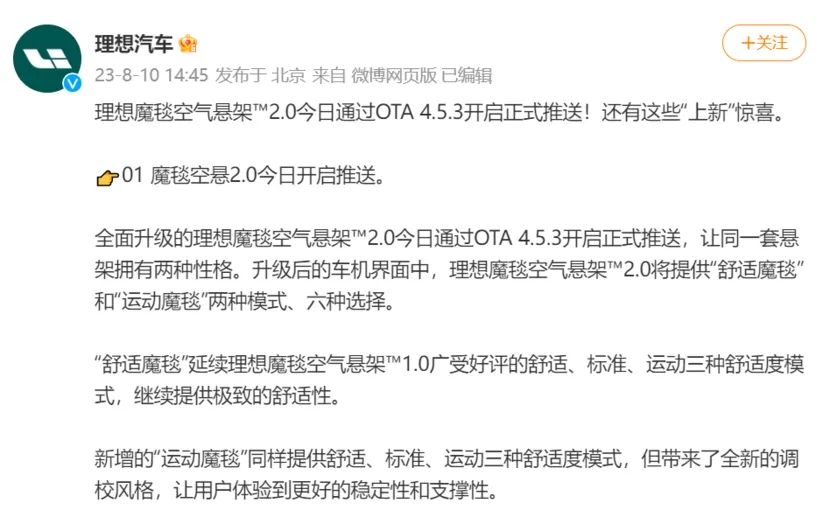 理想則于8月10日通過OTA將空氣懸掛玩出了新花樣,一套懸掛,帶給用戶不同的駕乘體驗。
