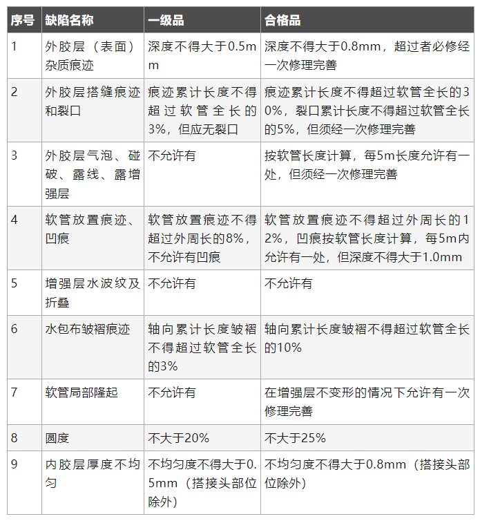 注:本表第5、6項不適用于吸引類橡膠軟管。