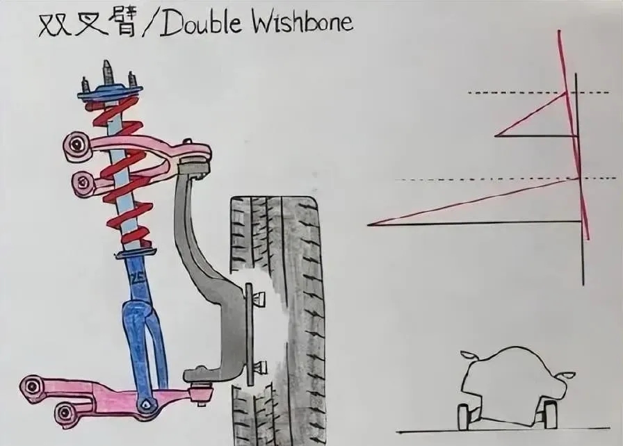 雙叉臂懸掛可以看作是麥弗遜懸掛的改良升級版。它將原本由麥弗遜下臂單獨(dú)承受的力分散到了兩根連桿上。其最大優(yōu)點(diǎn)在于,動態(tài)行駛中由于上臂短于下臂,能夠改變車輪的外傾角,從而顯著提升車輛的極限操控性能。不過,與麥弗遜懸掛相比,雙叉臂懸掛的成本更高,且占用空間更大。橡膠墊圈的作用