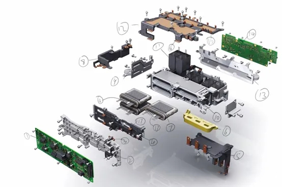 (1)驅動板,(2)驅動板支架,(3)高壓母線采樣線束,(4)三相輸出疊層銅排,(5)三相銅排,(6)母線一體霍爾,(7)日立雙面水冷IGBT模塊,(8)疊層母排,(9)出水口蓋板,(10)IGBT冷卻水道,(11)母線電容,(12)正(或者負)母排,不知道哪個是正負,(13)進水口蓋板,(14)控制板,(15)電容引腳焊接點,(16)IGBT中間四引腳焊接點,(17)IGBT粗引腳焊接處,(18)IGBT水道另一端蓋板。密封圈是橡膠硅膠材料嗎有毒嗎