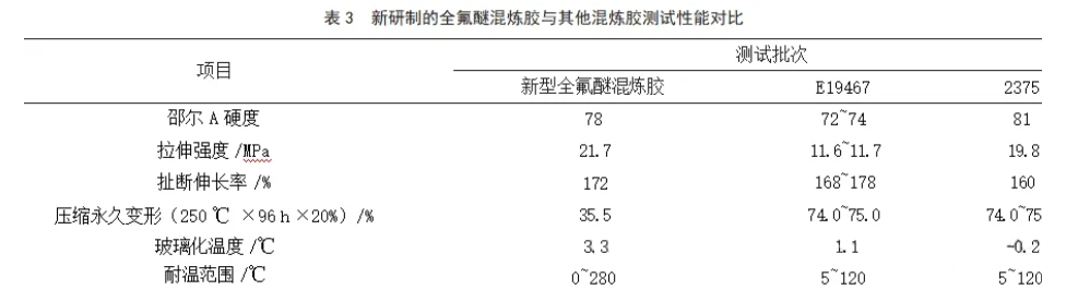 表3顯示,新研制的FFKM混煉膠在常溫拉伸強度與斷裂伸長率上優于其他混煉膠,表明其力學性能突出。同時,高溫壓縮永久變形顯著降低,能在280℃下穩定使用,展現出卓越的高溫性能。表4則證實了其優異的耐介質性能,達到一級相容標準。氟橡膠產品