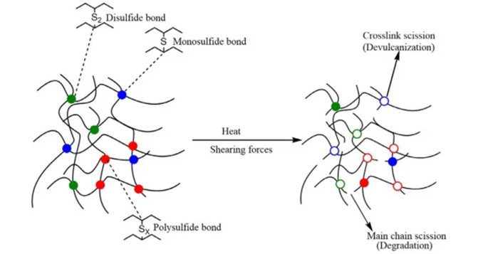 多硫交聯(lián)鍵的分解:在高溫下,硫磺硫化形成的多硫鍵(如S-S-S或S-S鍵)易分解,轉(zhuǎn)化為單硫鍵(C-S-C鍵)或硫醇(R-SH),導(dǎo)致網(wǎng)絡(luò)結(jié)構(gòu)弱化。