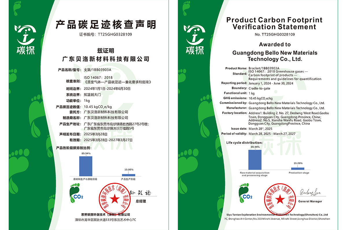 2024年,思譽碳探環保技術(深圳)有限公司依據ISO 14067:2018《溫室氣體-產品碳足跡-量化要求和指南》要求,公司生產的1kg支架半生命周期(“搖籃到大門”)的碳足跡為10.45kgCO2e。