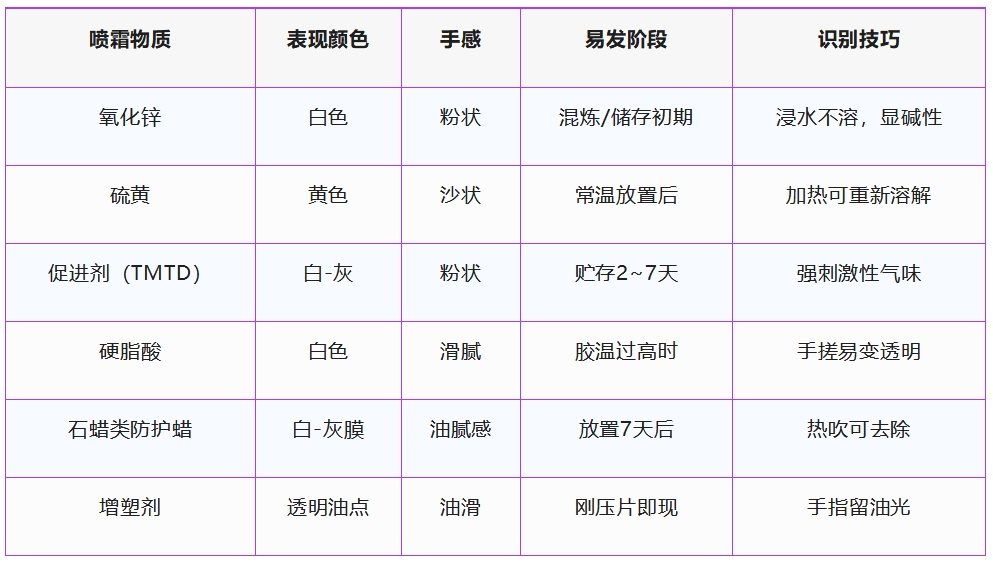結晶型噴霜:如硬脂酸、氧化鋅等粉末析出,常呈白色薄霜狀。