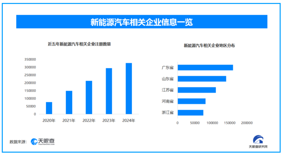 從區域分布來看,廣東省、山東省、江蘇省的新能源汽車相關企業數量位居全國前列,三省市企業數量總和超過41萬家,占企業總數的27.5%。