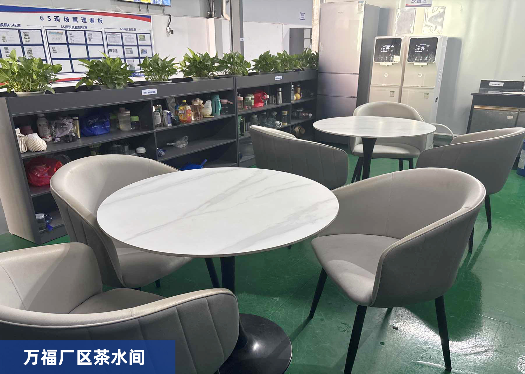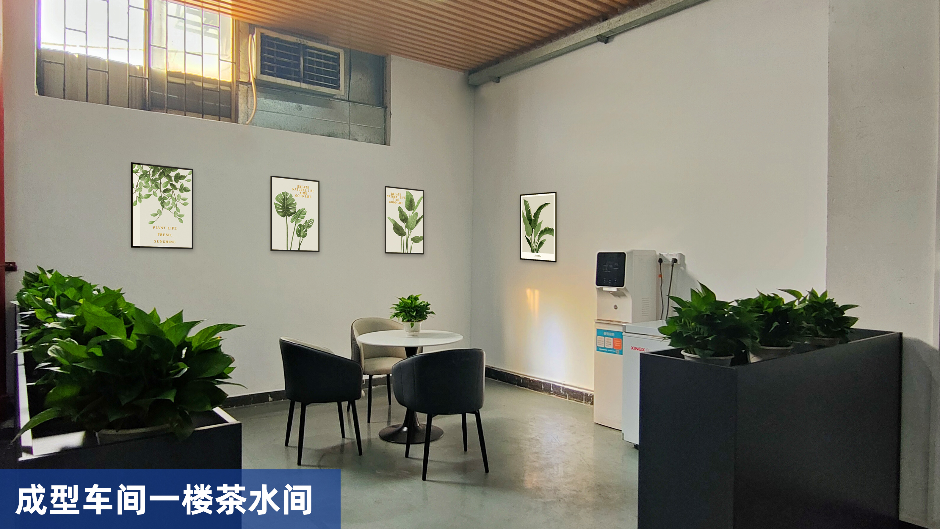 車間茶水間不僅設備齊全,環境也十分舒適。設有自熱飲水機、舒適的座椅和茶幾,還有公用冰箱,為大家提供了冷藏食物和飲品的便利,杯具放置處則方便大家存放和使用個人杯具。