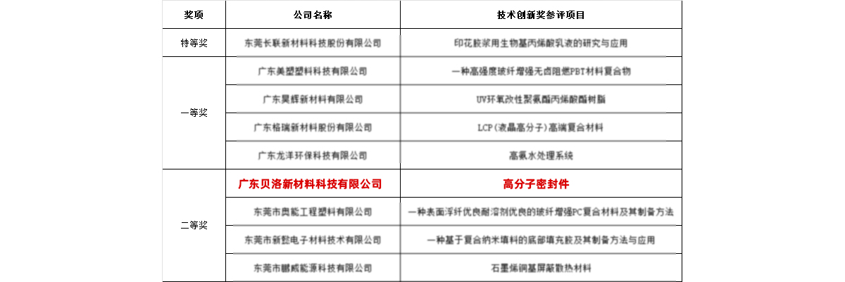 貝洛新材經(jīng)過東莞市新材料行業(yè)協(xié)會(huì)組織的相關(guān)專家對(duì)申報(bào)項(xiàng)目及企業(yè)進(jìn)行審查后,獲“新材料技術(shù)創(chuàng)新獎(jiǎng)”二等獎(jiǎng)。