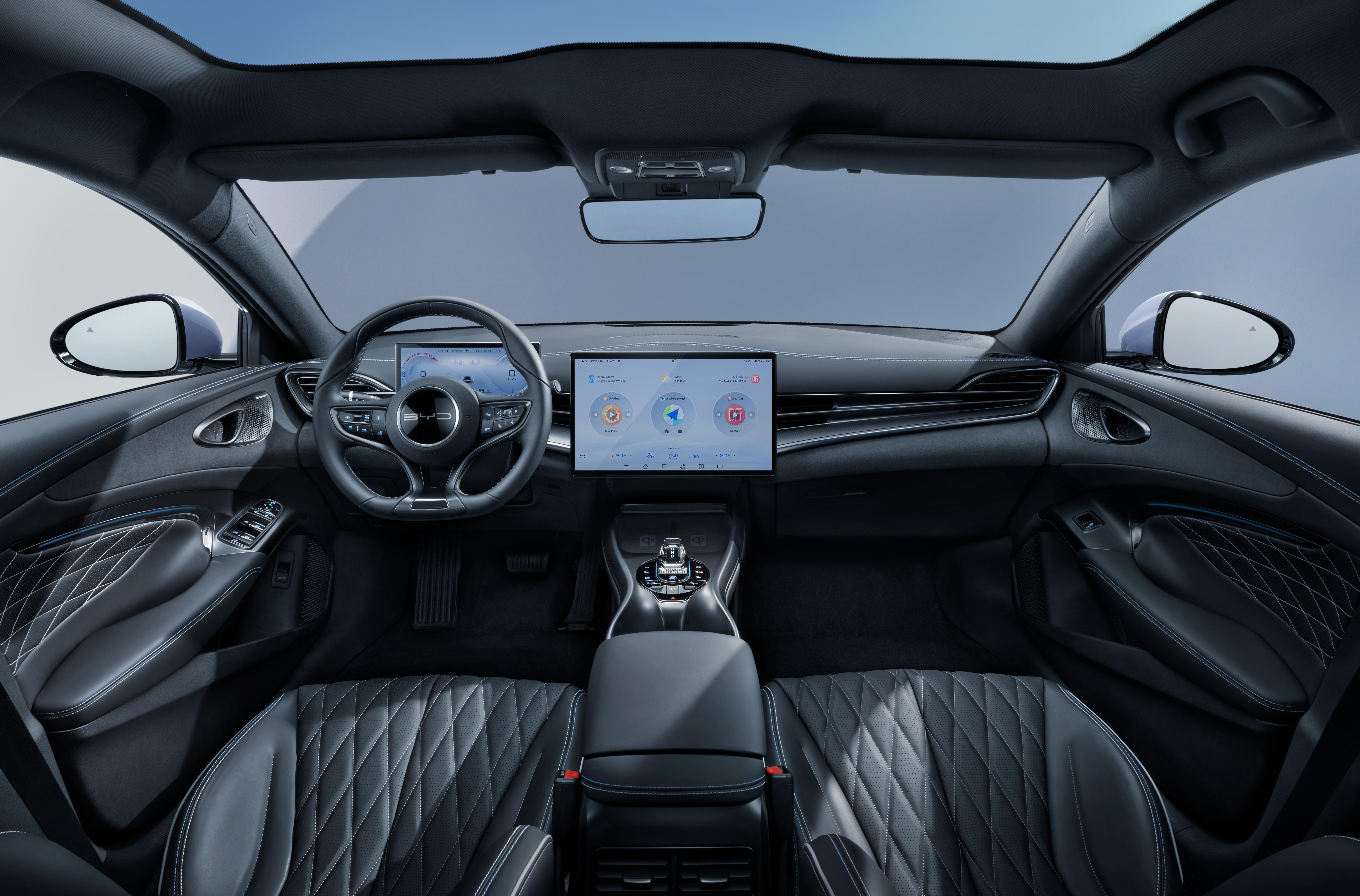 車尾部分,新車采用了時下流行的貫穿式尾燈組,兩側尾燈主體采用了水滴式的造型設計,配合透明燈殼,讓新車展現出了時尚動感的屬性。后包圍則利用雙層雙色的設計,展現出了尾部擴散器的犀利感,進一步提升了新車的動感氛圍。海豹冠軍版提供北冰藍、極光白、玄空黑、亞特蘭蒂斯灰四種車身配色,另外提供風卷草綠和迷迭灰作為選配。