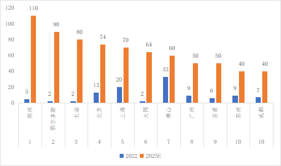 圖1:2025年加氫站規(guī)劃數(shù)量TOP10城市資料