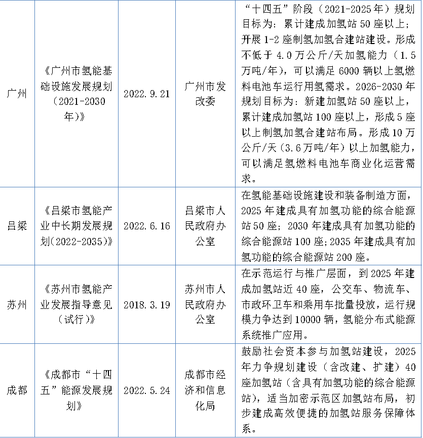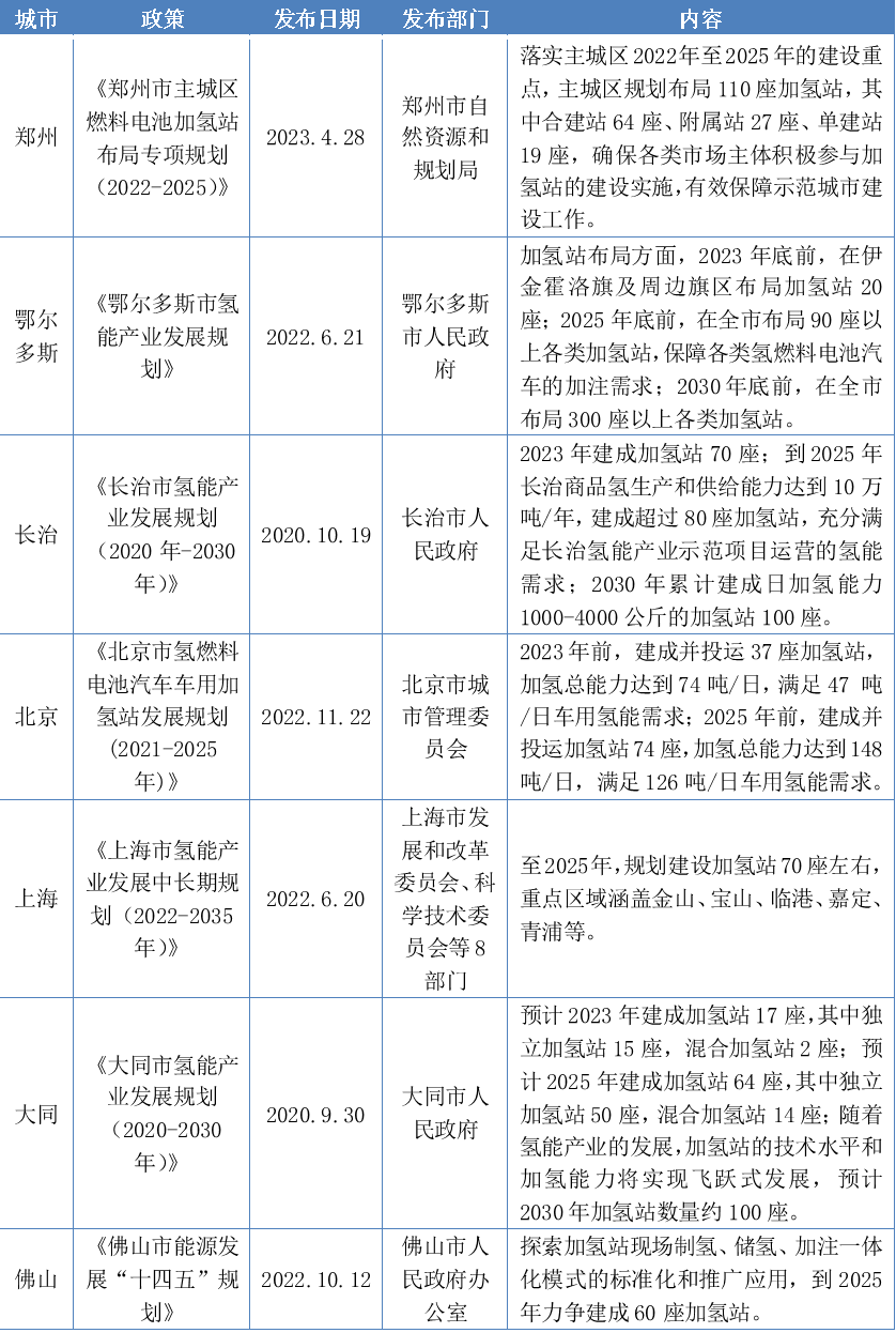 表 1:2025年加氫站規(guī)劃數(shù)量TOP10城市出臺政策詳情