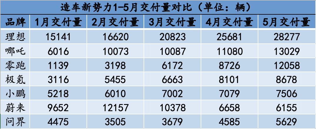 如上圖所示,這是新勢力們公布出來的交付量,以及1-5月份每個月的交付量。