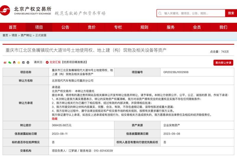 2023-08-24 14:08:59近日,一則名為“重慶市江北區魚嘴鎮現代大道18號土地使用權、地上建(構)筑物及相關設備等資產”的資產轉讓披露公告顯示,轉讓方為北京現代汽車有限公司重慶分公司,轉讓底價為36.84億元。要知道,當年該工廠的總投資為77.5億元,這意味著北京現代重慶工廠五折掛牌出售。